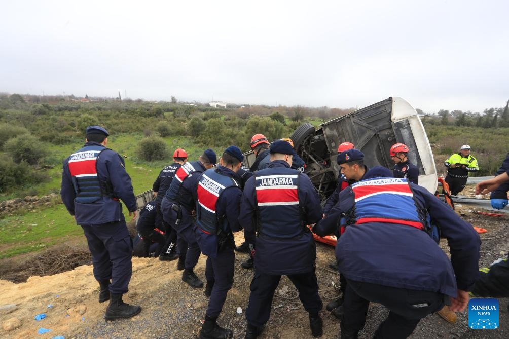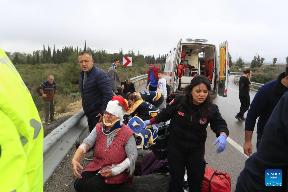 ANKARA, Feb. 1 (Xinhua) -- Eight people were killed and 26 others injured when a passenger bus travelling in southern Türkiye's Antalya province veered off the road and overturned into a ditch on Sunday, local broadcaster NTV reported.