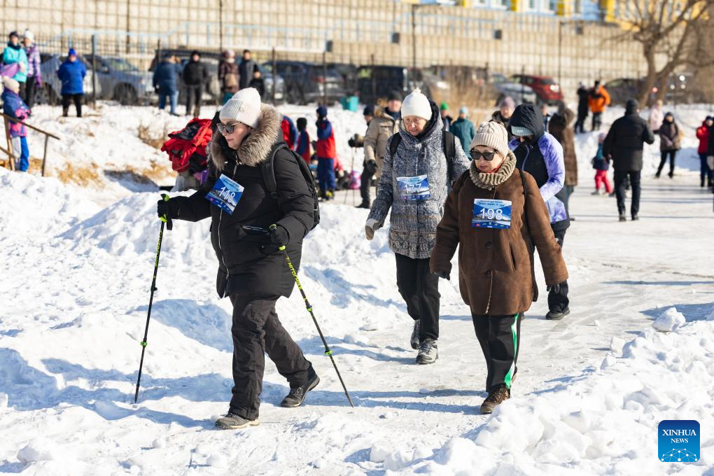 People participate in a walking competition during an ice and snow festival in Vladivostok, Russia, on Jan. 31, 2026. (Photo by Andrey Matveenko/Xinhua)