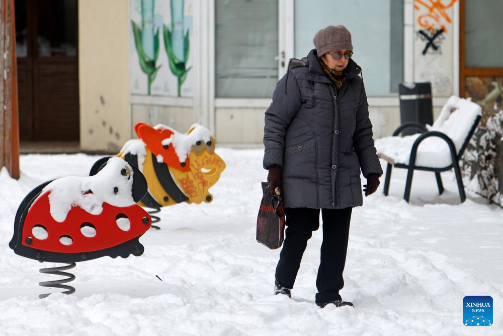 A woman walks through a snow-covered playground in Bucharest, Romania, on Feb. 2, 2026. Romania's National Meteorological Administration (ANM) on Monday issued a Code Yellow warning for severe cold and frost, affecting more than half of the country, from Monday morning until Tuesday. (Photo by Cristian Cristel/Xinhua)