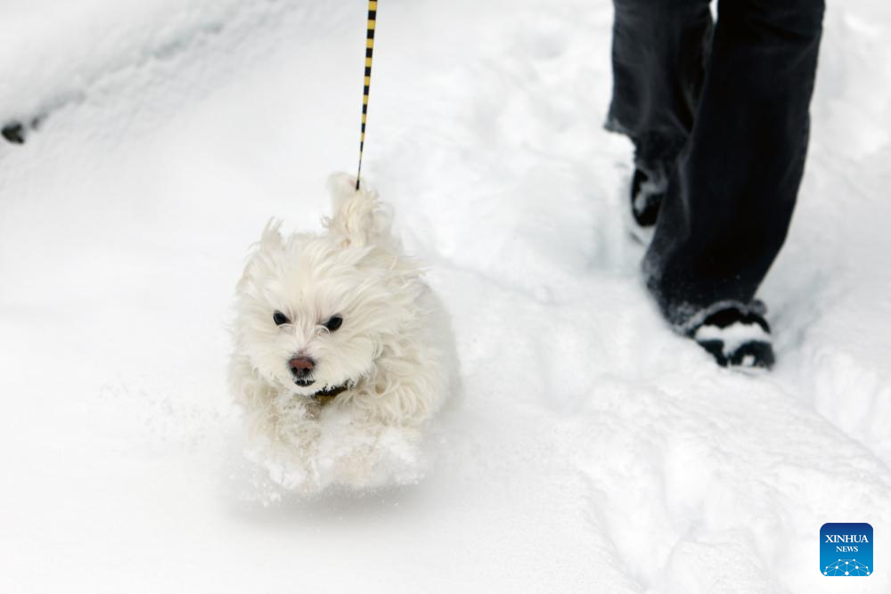 A dog jumps through snow on a street in Bucharest, Romania, on Feb. 2, 2026. Romania's National Meteorological Administration (ANM) on Monday issued a Code Yellow warning for severe cold and frost, affecting more than half of the country, from Monday morning until Tuesday. (Photo by Cristian Cristel/Xinhua)