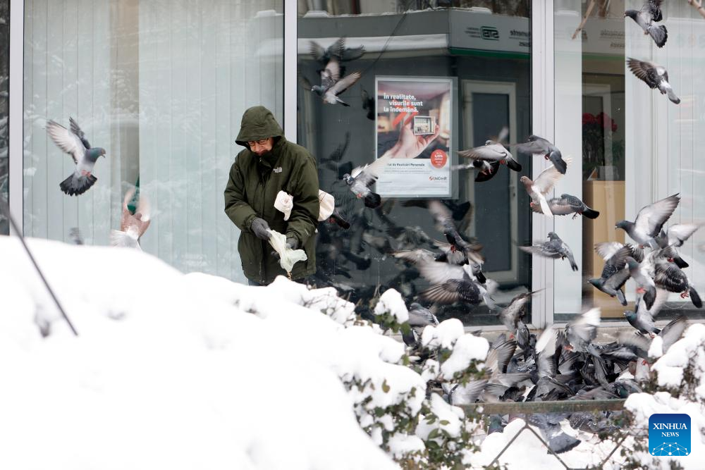 A man feeds pigeons on a snow-covered street in Bucharest, Romania, on Feb. 2, 2026. Romania's National Meteorological Administration (ANM) on Monday issued a Code Yellow warning for severe cold and frost, affecting more than half of the country, from Monday morning until Tuesday. (Photo by Cristian Cristel/Xinhua)