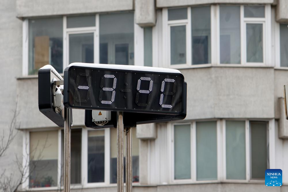 A street thermometer displays the temperature in Bucharest, Romania, on Feb. 2, 2026. Romania's National Meteorological Administration (ANM) on Monday issued a Code Yellow warning for severe cold and frost, affecting more than half of the country, from Monday morning until Tuesday. (Photo by Cristian Cristel/Xinhua)