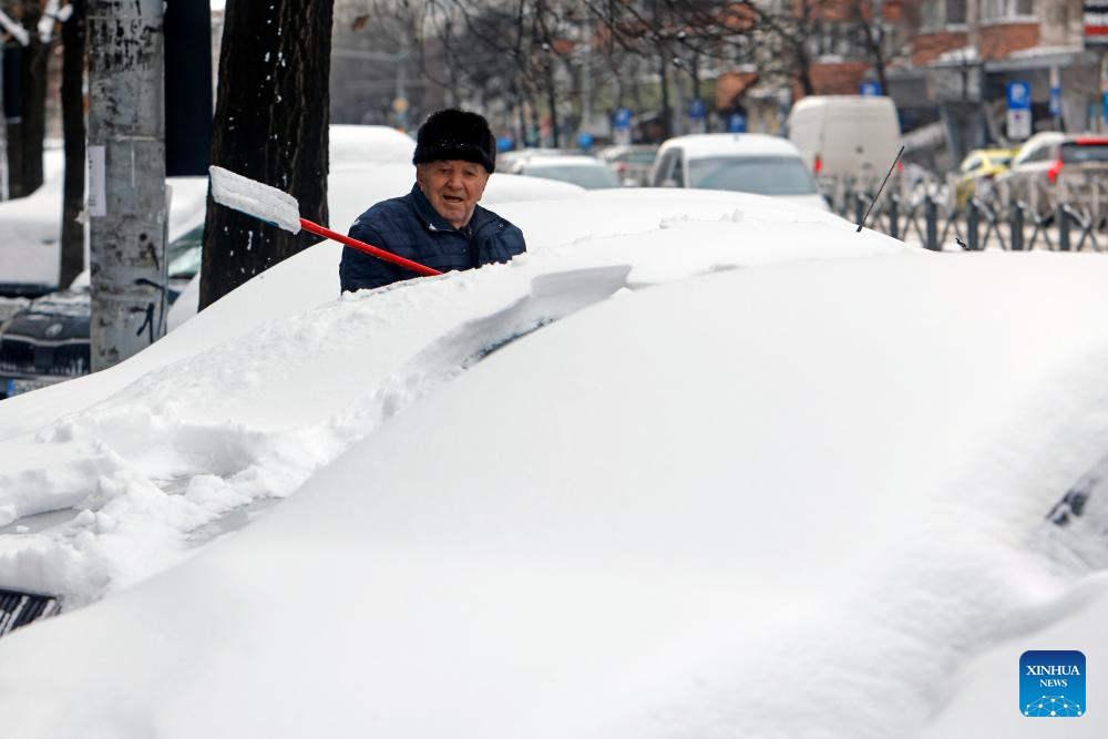 A man cleans his snow-covered car in Bucharest, Romania, on Feb. 2, 2026. Romania's National Meteorological Administration (ANM) on Monday issued a Code Yellow warning for severe cold and frost, affecting more than half of the country, from Monday morning until Tuesday. (Photo by Cristian Cristel/Xinhua)