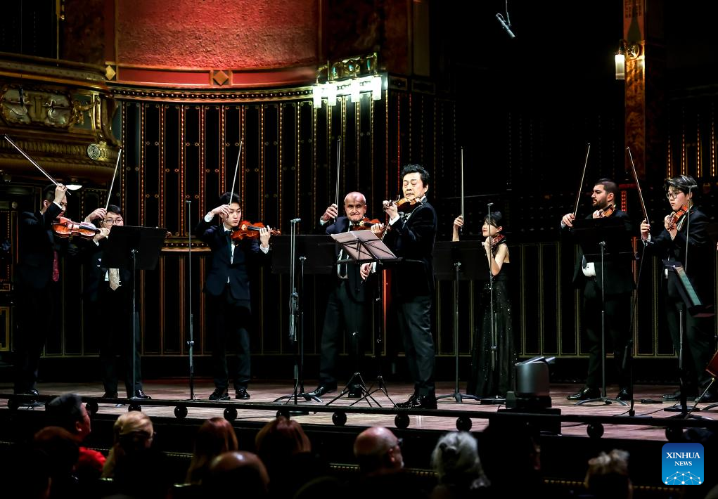 Chinese violinist Lyu Siqing (4th R) performs during "The New Four Seasons of Hungary and China Concert" at the Liszt Academy of Music in Budapest, Hungary, Feb. 2, 2026. A China-Hungary musical joint premiere was held Monday evening in Budapest as the European tour of "The New Four Seasons of Hungary and China Concert" opened at the Liszt Academy of Music. (Photo by David Balogh/Xinhua)