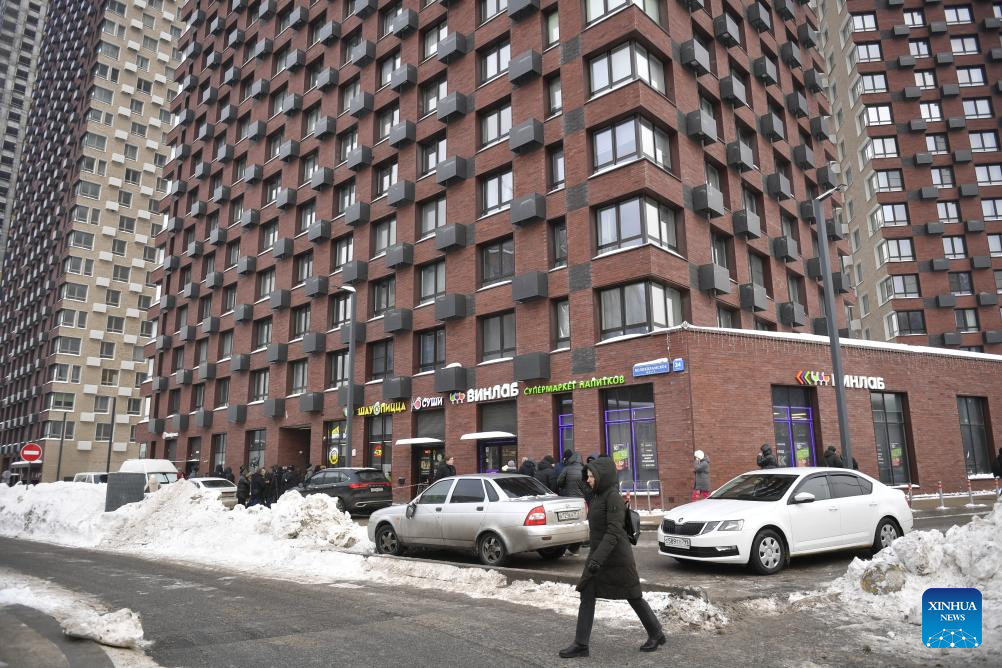 A citizen walks past a residential building, where an unidentified individual opened fire, beside Volokolamsk Highway in Moscow, Russia, Feb. 6, 2026. Russian Defense Ministry Lieutenant General Vladimir Alekseyev was hospitalized after an assassination attempt on Friday in northwest Moscow, the Russian Investigative Committee said.