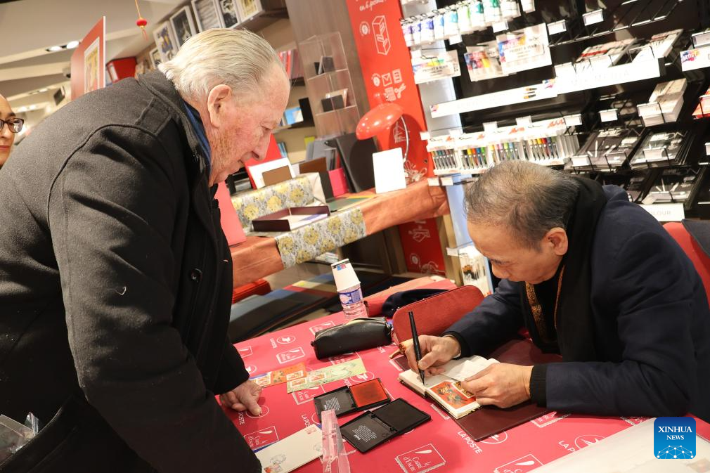 Chen Jianghong (R), an artist of Chinese origin, also the designer of the stamps, signs on the Year of the Horse commemorative stamps during a launching ceremony in Paris, France, Feb. 6, 2026. France's La Poste Group on Friday issued two stamps to celebrate the upcoming Chinese Lunar New Year, the Year of the Horse. (Xinhua/Zhang Baihui)