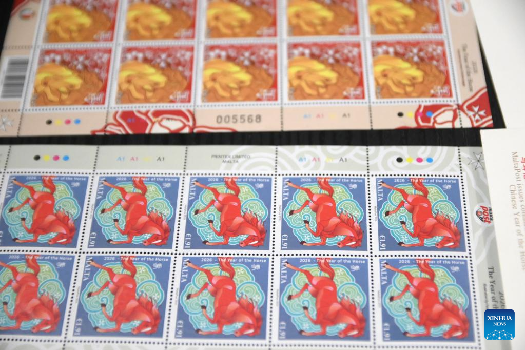 Photo taken on Feb. 9, 2026 shows MaltaPost's Year of the Horse commemorative postage stamps in Valletta, Malta. MaltaPost on Monday unveiled its Year of the Horse commemorative postage stamps in Valletta, marking the third consecutive year the country has issued stamps celebrating the Chinese Lunar New Year. (Photo by Jonathan Borg/Xinhua)