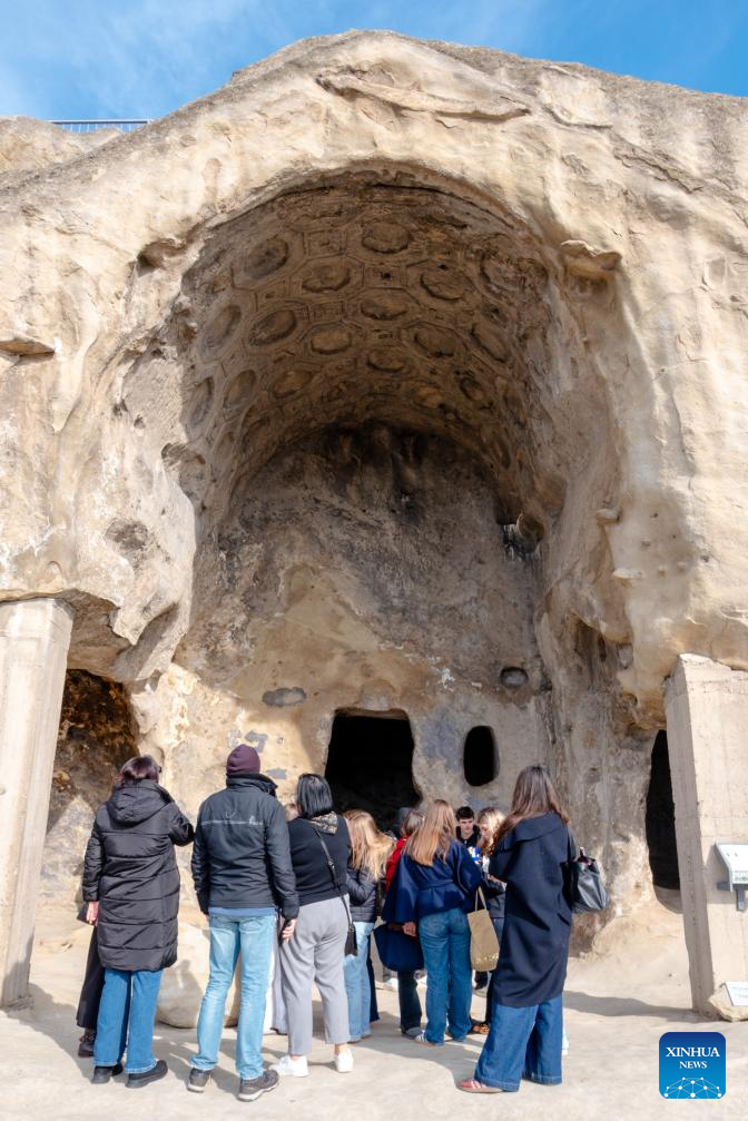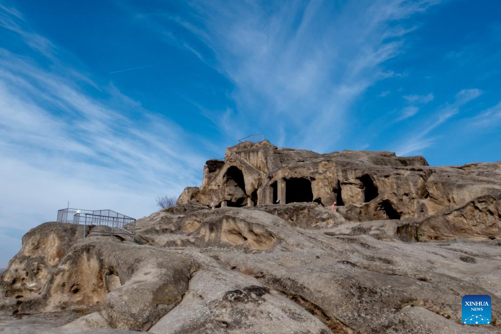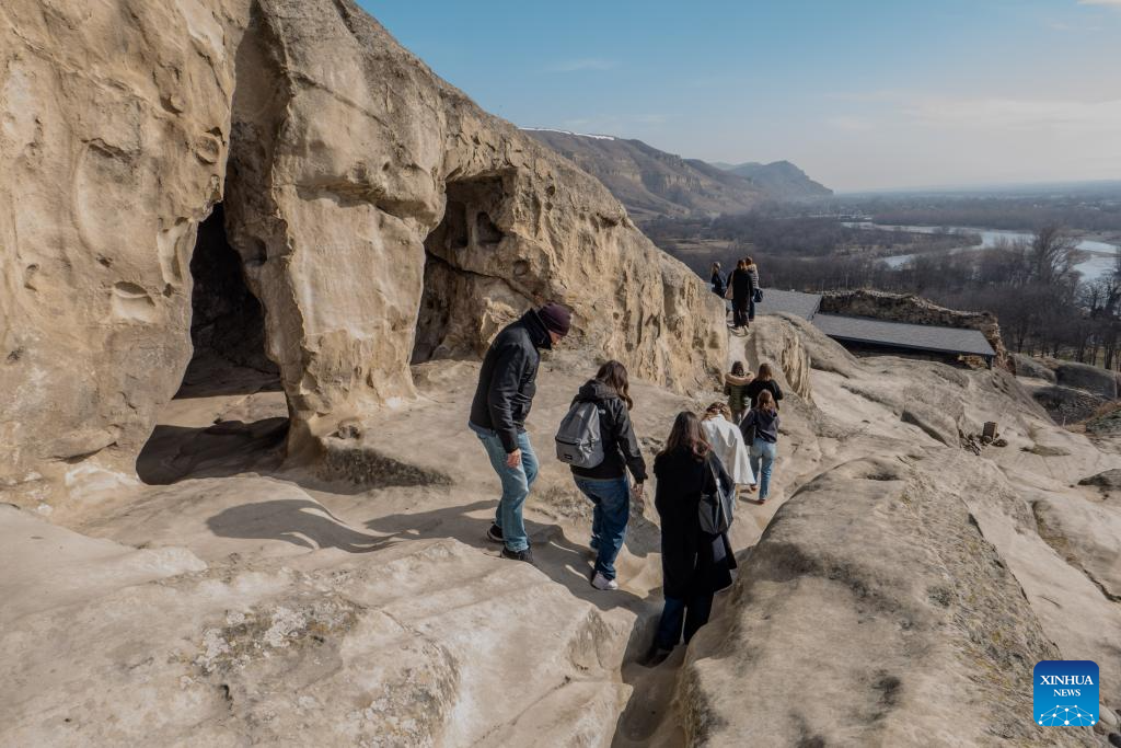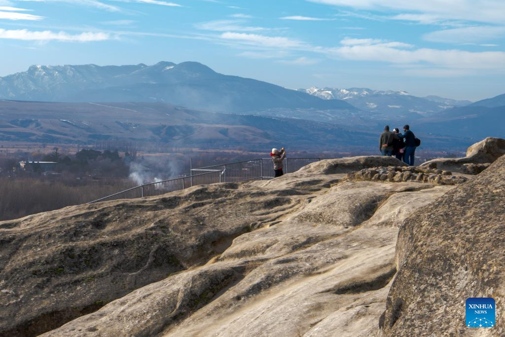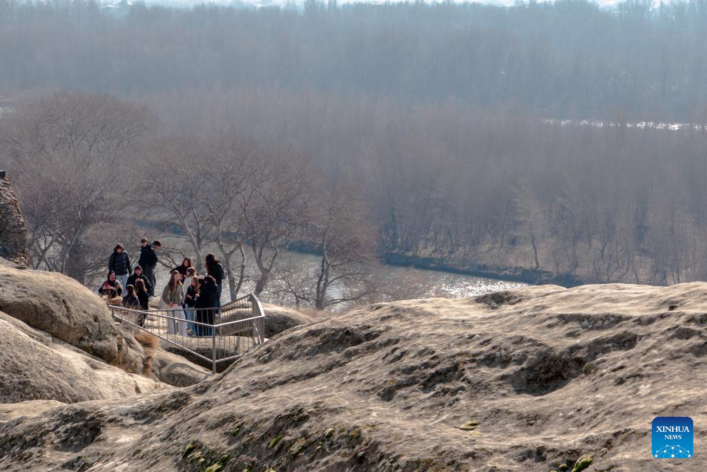 People visit the ruins of the Uplistsikhe rock-hewn city near Gori, Georgia, on Jan. 30, 2026. The Uplistsikhe rock-hewn city ruins is located on a high rocky hill on the bank of the Kura River near Gori in Georgia. It has been on the UNESCO World Heritage Tentative List since 2007. (Xinhua/Chen Junfeng)