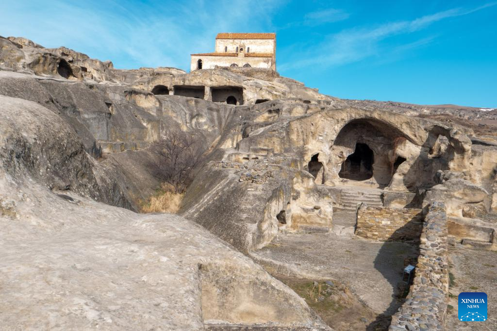 This photo taken on Jan. 30, 2026 shows the ruins of the Uplistsikhe rock-hewn city near Gori, Georgia. The Uplistsikhe rock-hewn city ruins is located on a high rocky hill on the bank of the Kura River near Gori in Georgia. It has been on the UNESCO World Heritage Tentative List since 2007. (Xinhua/Chen Junfeng)