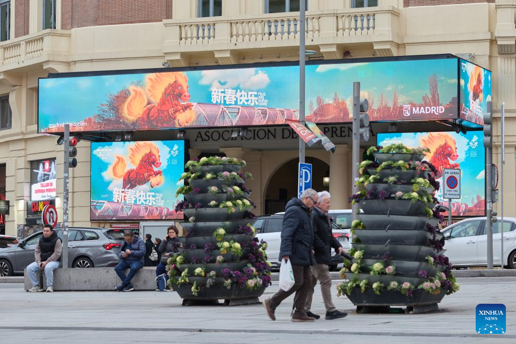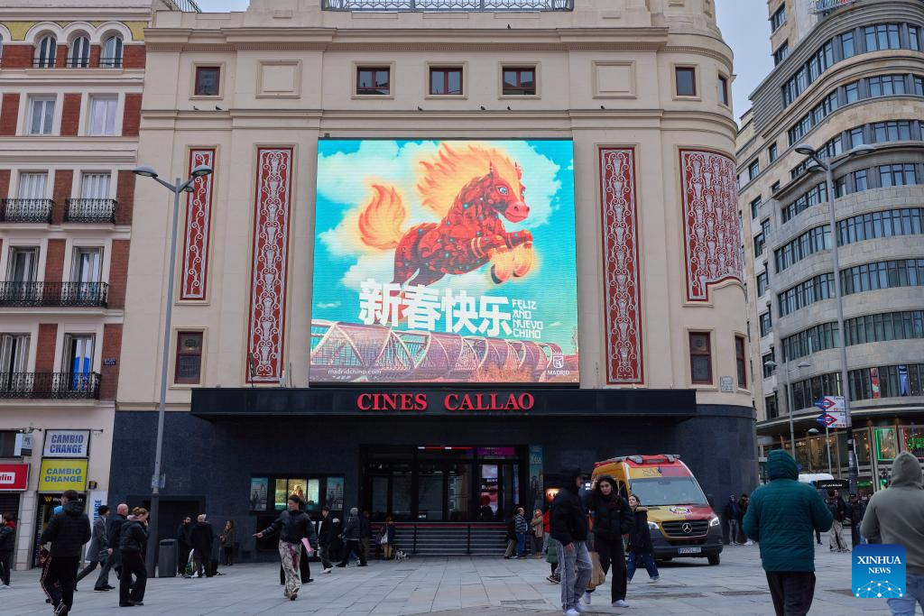 A video about the Chinese New Year is seen in Madrid, Spain, on Feb. 11, 2026. (Xinhua/Meng Dingbo)