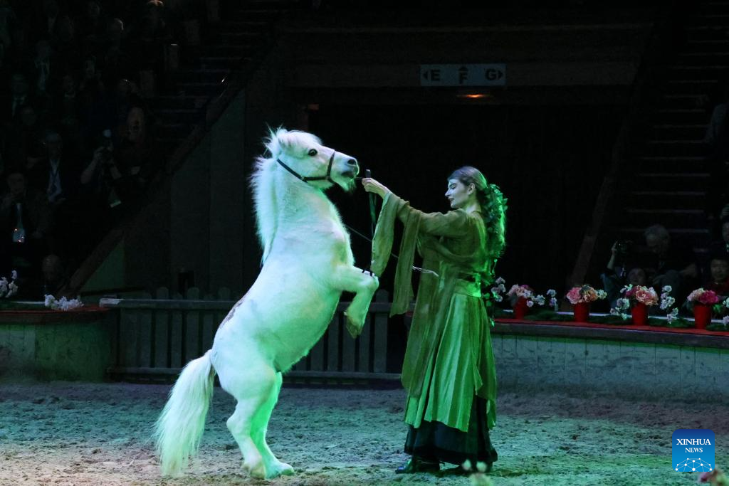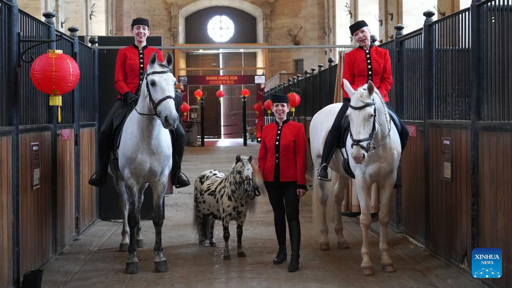 A traditional French equestrian performance is staged during a gala celebrating the Chinese Year of the Horse at the Great Stables in the estate of the Chateau de Chantilly in the Hauts-de-France region, France, Feb. 11, 2026. Co-hosted by the Hauts-de-France regional authorities and the Chinese Embassy in France, the event was distinct from many other Chinese New Year activities. At the Great Stables, the highlight was a distinctly local art form: traditional French equestrian performance.(Xinhua/Zhang Baihui)