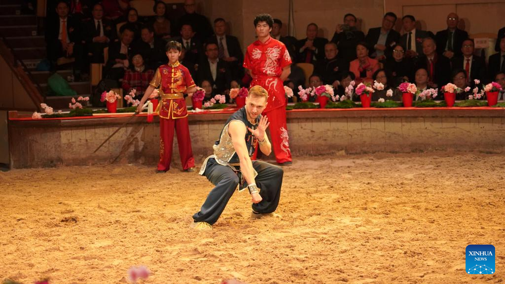 An artist performs martial arts during a gala celebrating the Chinese Year of the Horse at the Great Stables in the estate of the Chateau de Chantilly in the Hauts-de-France region, France, Feb. 11, 2026. Co-hosted by the Hauts-de-France regional authorities and the Chinese Embassy in France, the event was distinct from many other Chinese New Year activities. At the Great Stables, the highlight was a distinctly local art form: traditional French equestrian performance.(Xinhua/Cui Kexin)