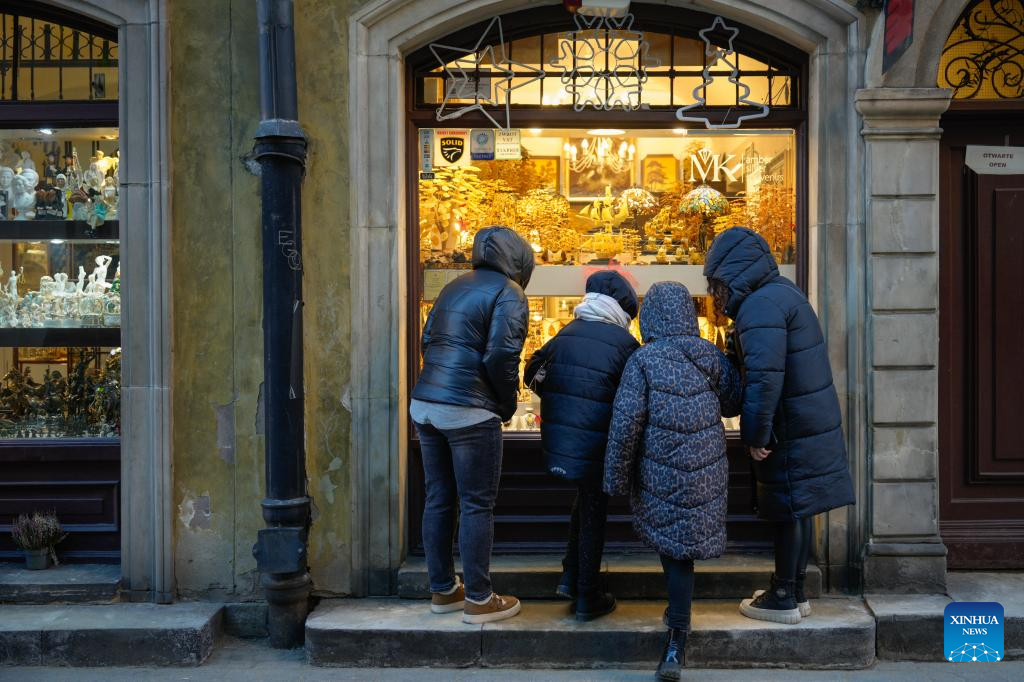 Visitors view ornaments made from amber at a shop in the Old Town in Warsaw, Poland, on Feb. 15, 2026. (Photo by Jaap Arriens/Xinhua)