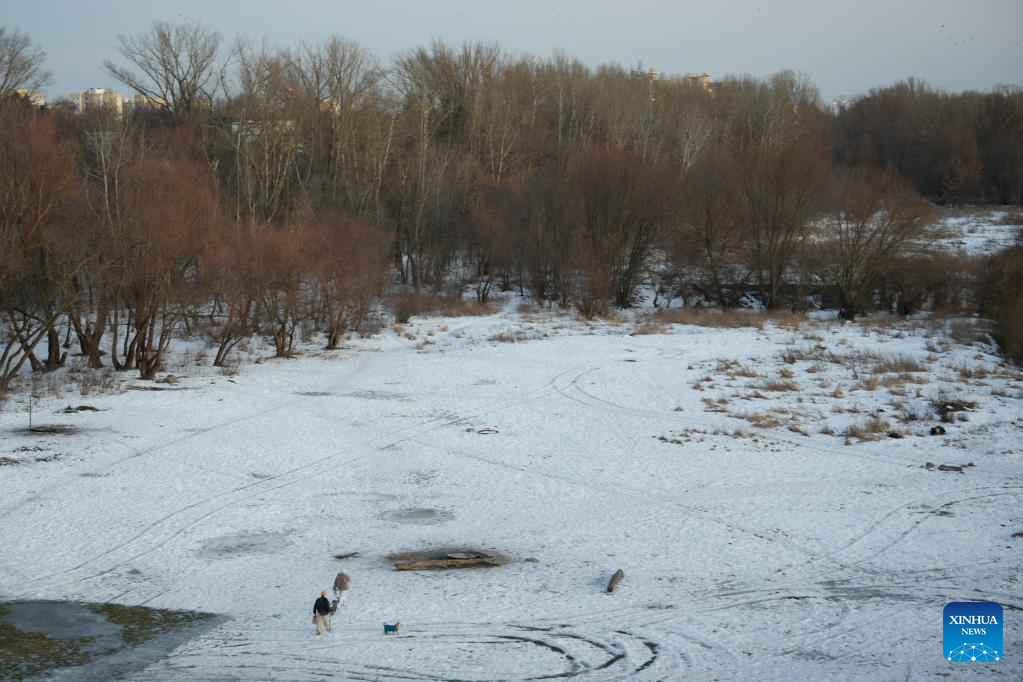 People walk their dogs along the Vistula River in Warsaw, Poland, on Feb. 15, 2026. (Photo by Jaap Arriens/Xinhua)