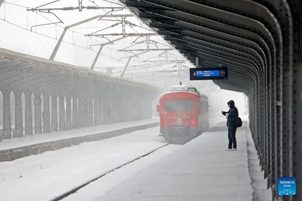 A man is pictured amid snowfall on a platform at North Railway station in Bucharest, Romania, on Feb. 21, 2026. Heavy snow, strong winds and icy conditions on Saturday again affected roads, maritime ports and power supplies across southern and eastern Romania, according to authorities. (Photo by Cristian Cristel/Xinhua)