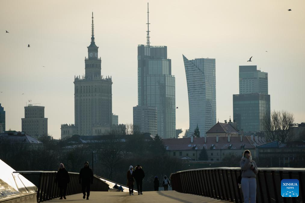 People walk on a pedestrian bridge in Warsaw, Poland, Feb. 20, 2026. (Photo by Jaap Arriens/Xinhua)