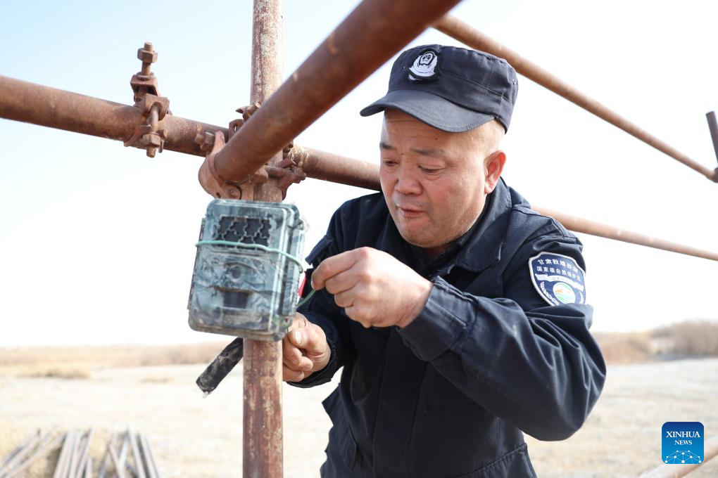 (260226) -- LANZHOU, Feb. 26, 2026 (Xinhua) -- Staff member of the Yumenguan Conservation Station Wang Chenghai checks the infrared camera at the Dunhuang West Lake National Nature Reserve in Dunhuang, northwest China's Gansu Province, Feb. 5, 2026. (Xinhua/Chen Bin)