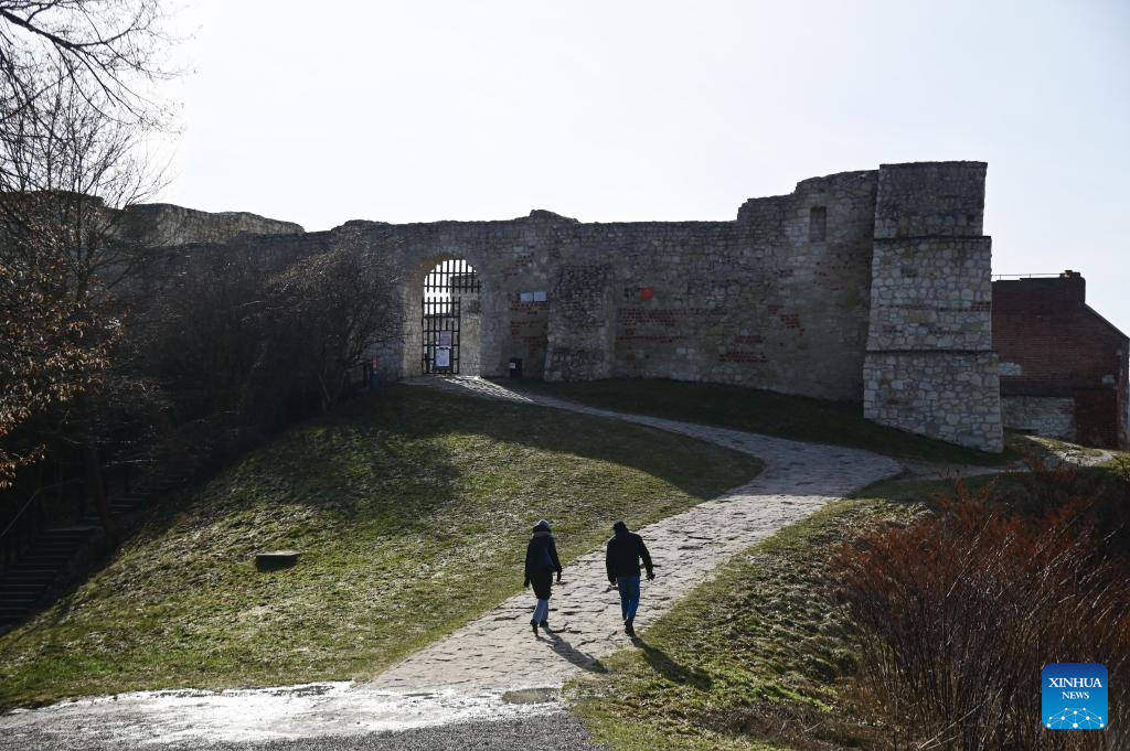 People visit the ruins of an ancient castle in Kazimierz Dolny, Poland, Feb. 27, 2026. Known for its well-preserved Renaissance-style urban layout, Kazimierz Dolny is a popular tourist destination in Poland. (Photo by Aleksy Witwicki/Xinhua)