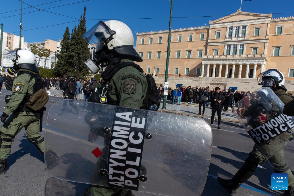 Greek riot police officers stand guard in front of the Hellenic Parliament at Syntagma Square in Athens, Greece, Feb. 28, 2026. Thousands of people took part in dozens of demonstrations across Greece on Saturday to mark the third anniversary of the train collision in Tempi, central Greece, which claimed 57 lives. (Xinhua/Marios Lolos)