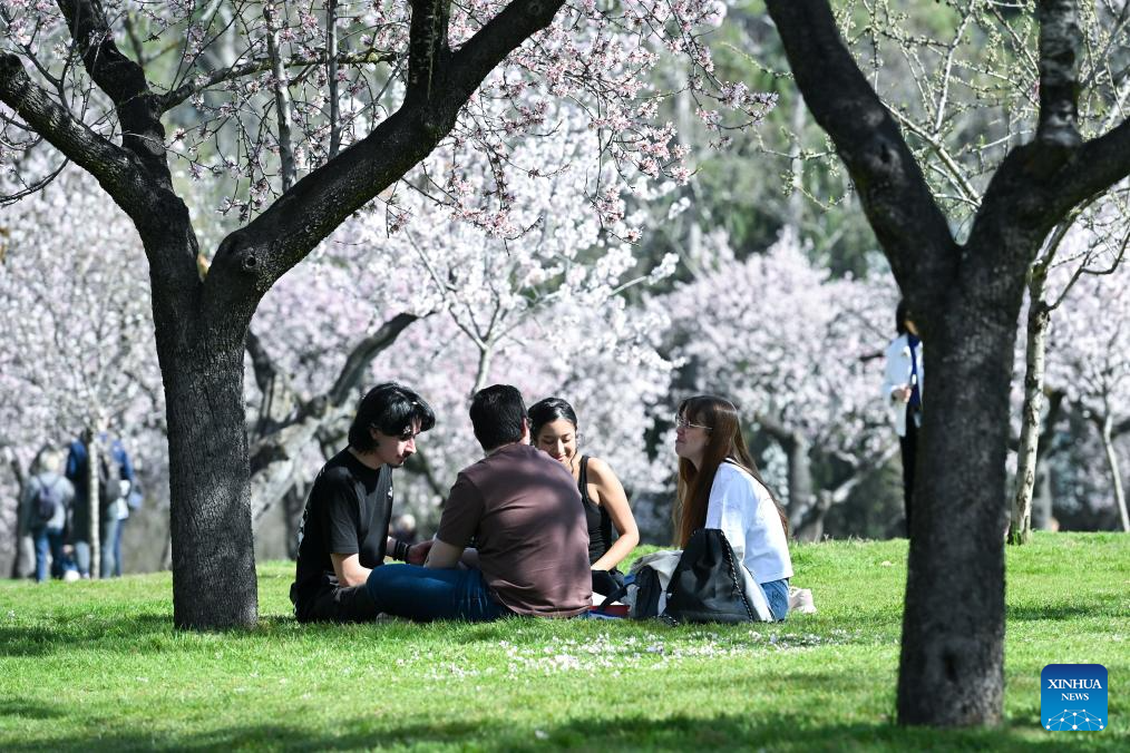 People spend time under the blossoming almond trees in a park in Madrid, Spain, on Feb. 27, 2026. (Photo by Gustavo Valiente/Xinhua)