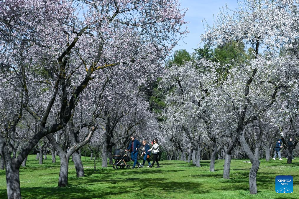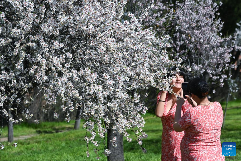 People enjoy almond blossoms in a park in Madrid, Spain, on Feb. 27, 2026. (Photo by Gustavo Valiente/Xinhua)