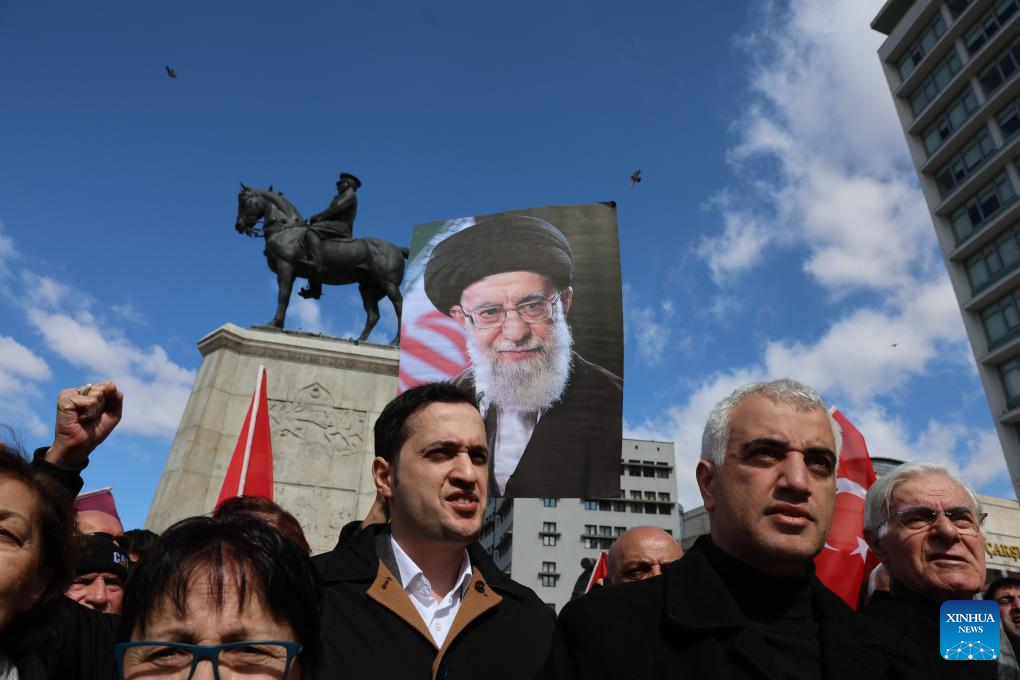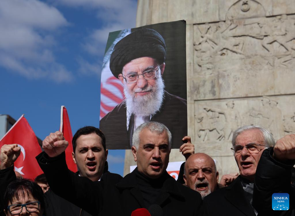 People hold an image of late Iran's Supreme Leader Ayatollah Ali Khamenei as they protest against the U.S.-Israeli strikes on Iran, in Ankara, Türkiye, March 1, 2026. (Mustafa Kaya/Handout via Xinhua)