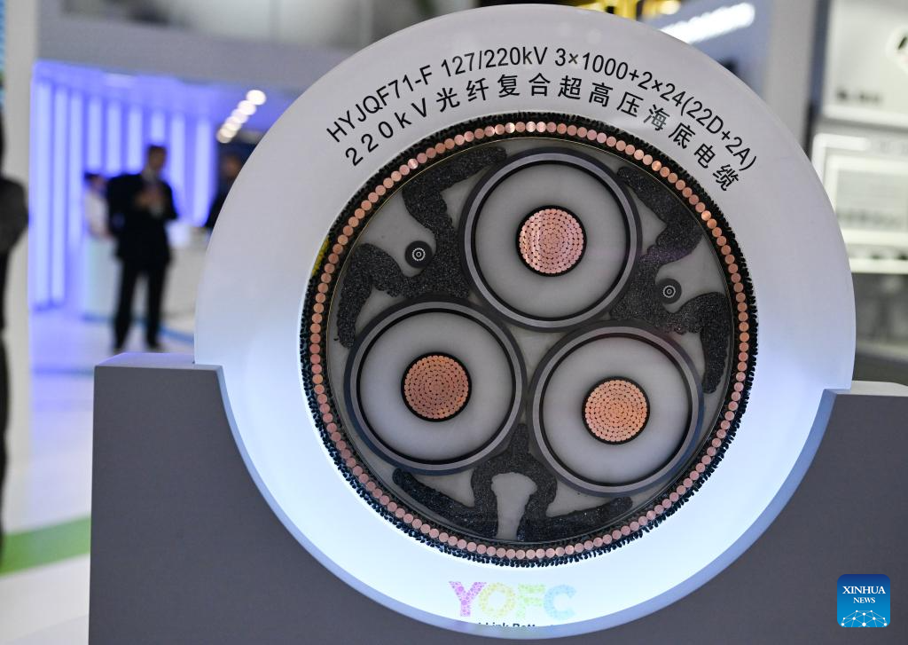 This photo taken on March 2, 2026 shows an optical fibre composite extra-high-tension submarine cable manufactured by China's Yangtze Optical Fibre and Cable Joint Stock Limited Company during the 2026 Mobile World Congress in Barcelona, Spain. The 2026 Mobile World Congress (MWC) opened on Monday in Barcelona, Spain. According to its organizers, a China Pavilion has been set up at the congress for the first time, featuring major Chinese companies including China Mobile, China Unicom, Huawei, ZTE, Honor and Xiaomi, showcasing their latest advancements in mobile communications and AI technologies. (Xinhua/Cheng Min)