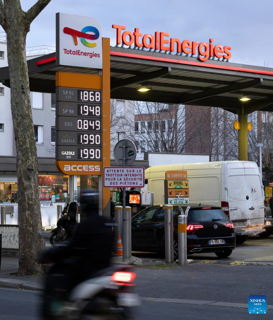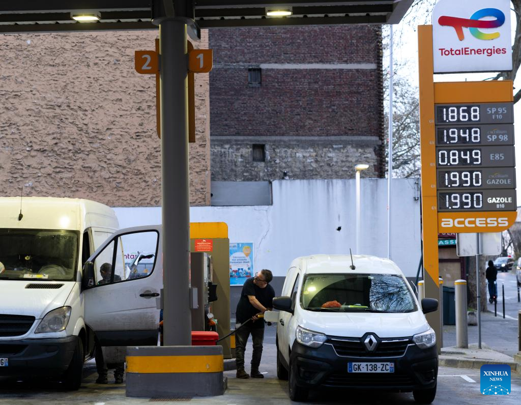 Vehicles refuel at a gas station in Paris, France, on March 9, 2026. The European Union (EU) is closely monitoring rising energy prices amid disruptions linked to the war in the Middle East, a European Commission spokesperson said on Monday. (Xinhua/Wu Huiwo)