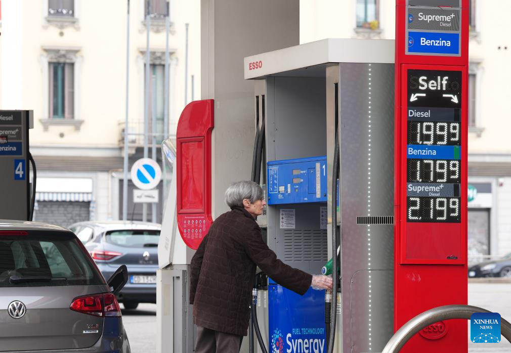 A man refuels his car at a gas station in Milan, Italy, on March 11, 2026. European Commission President Ursula von der Leyen said on Wednesday the Middle East conflict has imposed heavy economic costs on Europe, driving up energy prices and adding billions of euros to import bills. (Xinhua/Li Jing)