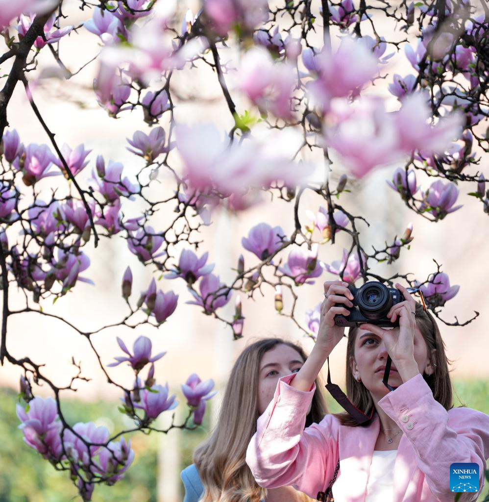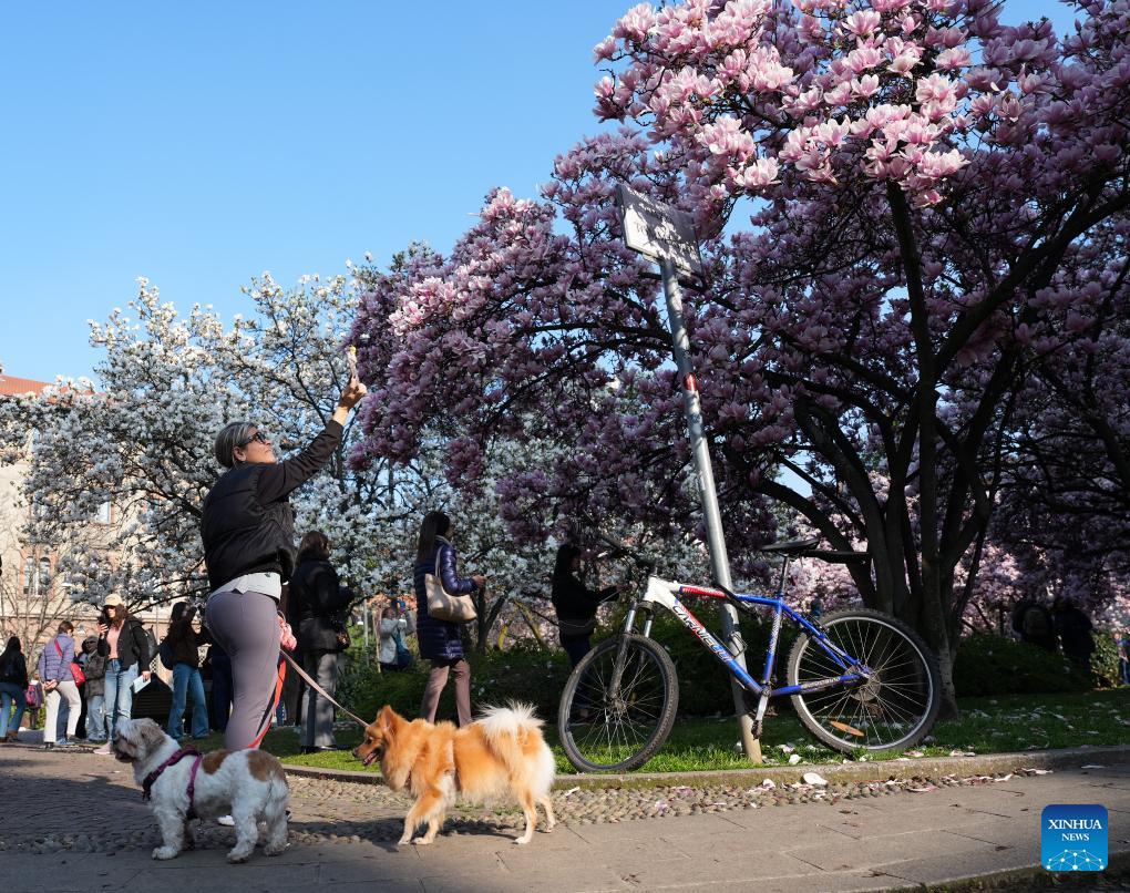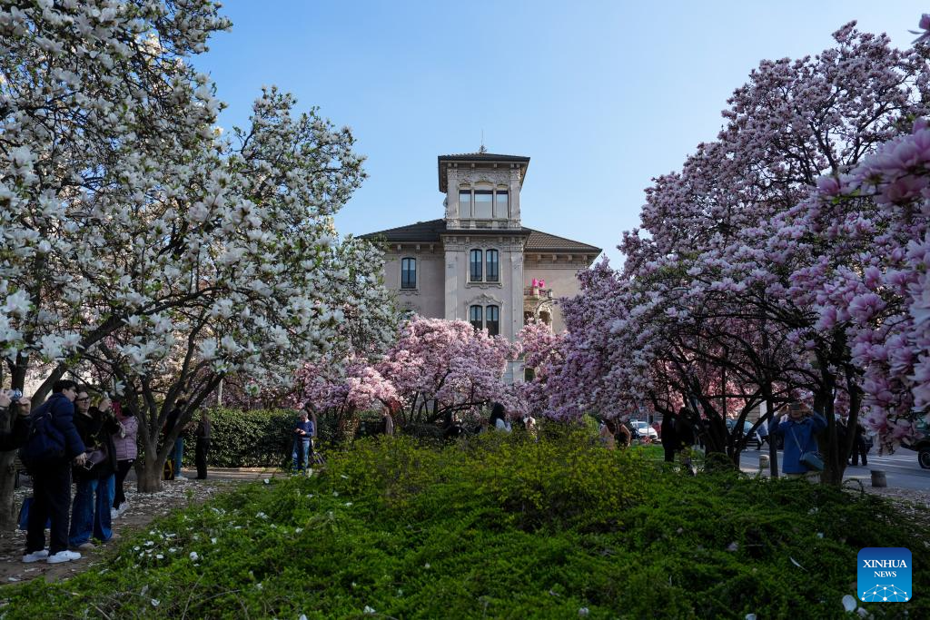 People view magnolia blossoms in Milan, Italy, March 13, 2026. (Xinhua/Li Jing)