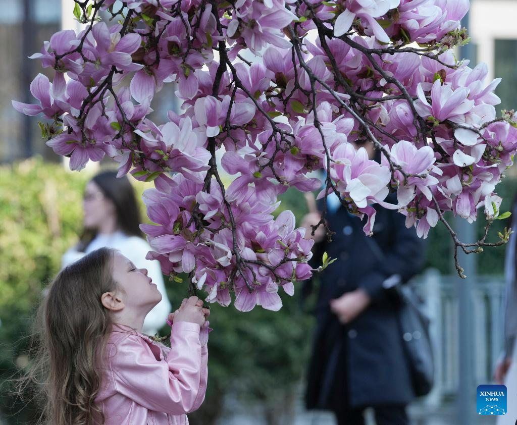 A girl smells at magnolia blossoms in Milan, Italy, March 13, 2026. (Xinhua/Li Jing)