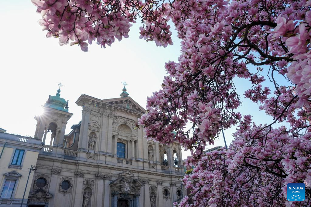 This photo taken on March 13, 2026 shows magnolia blossoms in Milan, Italy. (Xinhua/Li Jing)