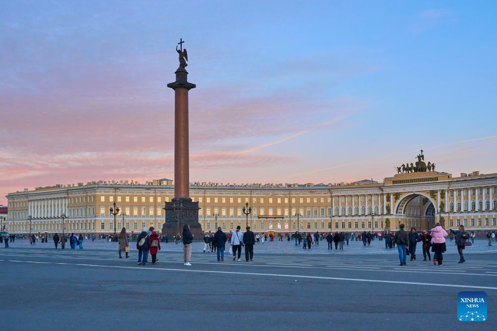 This photo taken on March 21, 2026 shows Palace Square at sunset in St. Petersburg, Russia. (Photo by Guo Feizhou/Xinhua)