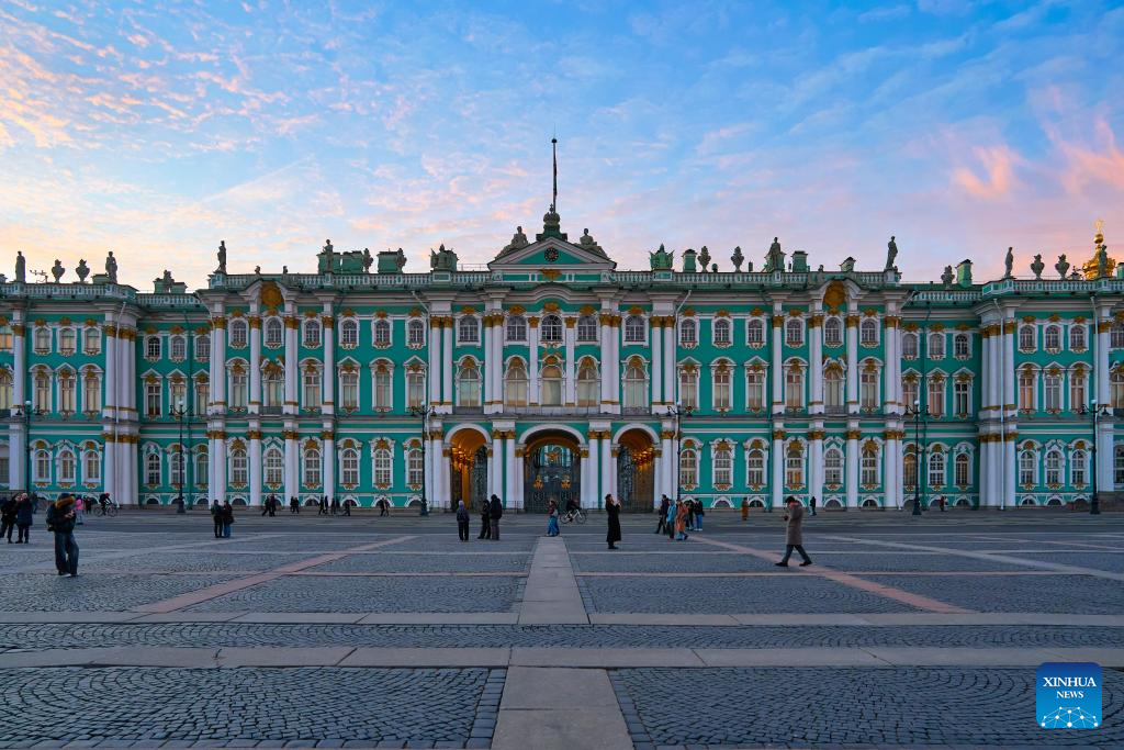 This photo taken on March 21, 2026 shows the State Hermitage Museum at sunset in St. Petersburg, Russia. (Photo by Guo Feizhou/Xinhua)