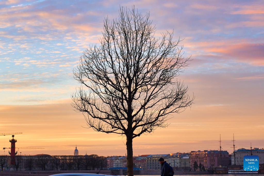 This photo taken on March 21, 2026 shows a sunset view in St. Petersburg, Russia. (Photo by Guo Feizhou/Xinhua)