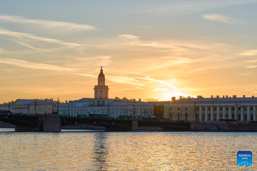 This photo taken on March 21, 2026 shows a sunset view of the Neva River in St. Petersburg, Russia. (Photo by Guo Feizhou/Xinhua)