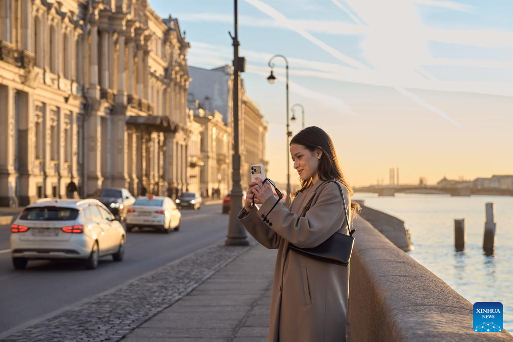 A woman takes a selfie by the Neva River at sunset in St. Petersburg, Russia on March 21, 2026. (Photo by Guo Feizhou/Xinhua)