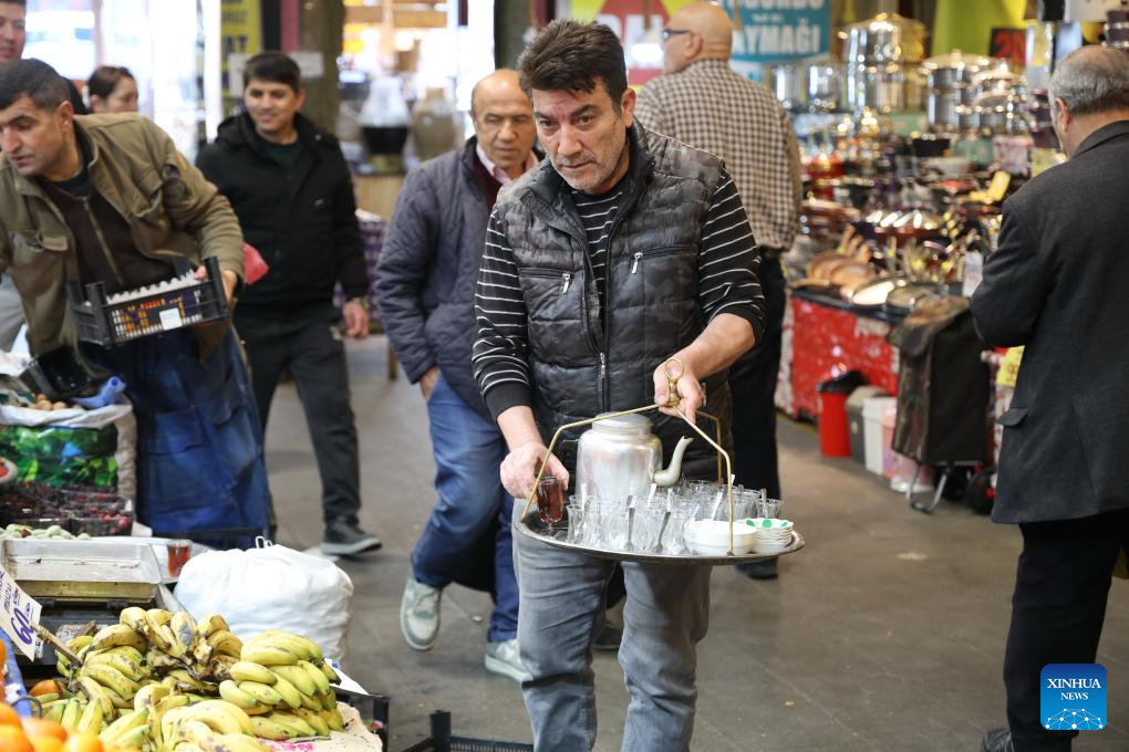 Tea sellers are iconic figures in Türkiye, weaving through streets and markets to deliver hot tea, typically served in small and tulip-shaped glasses. (Mustafa Kaya/Handout via Xinhua)