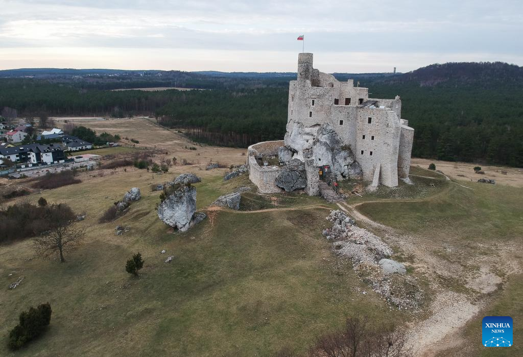 (260403) -- MIROW, April 3, 2026 (Xinhua) -- An aerial drone photo taken on April 2, 2026 shows the Mirow Castle in Mirow, Poland. Built in the mid-14th century, the castle is one of the medieval strongholds along the Trail of the Eagles' Nests. The Trail of the Eagles' Nests is a renowned historical and cultural tourism route in southern Poland. Connecting southern Polish cities of Krakow and Czestochowa, the route stretches about 160 km and features more than 20 medieval castles built on limestone cliffs. (Photo by Aleksy Witwicki/Xinhua)