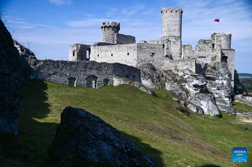(260403) -- OGRODZIENIEC, April 3, 2026 (Xinhua) -- This photo taken on April 2, 2026 shows the ruins of the Ogrodzieniec Castle in Podzamcze, Poland. Built in the 14th century, the castle is one of the most prominent medieval strongholds along the Trail of the Eagles' Nests. The Trail of the Eagles' Nests is a renowned historical and cultural tourism route in southern Poland. Connecting southern Polish cities of Krakow and Czestochowa, the route stretches about 160 km and features more than 20 medieval castles built on limestone cliffs. (Photo by Aleksy Witwicki/Xinhua)