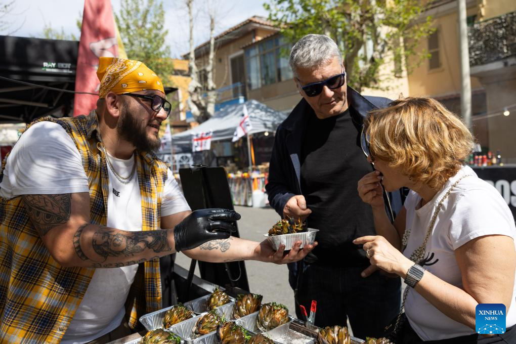 Artichokes are pictured during a Roman artichoke festival in Ladispoli, Italy, April 10, 2026. The annual festival celebrating the harvest of the Roman artichoke kicked off on Friday. (Xinhua/Wang Kaiyan)