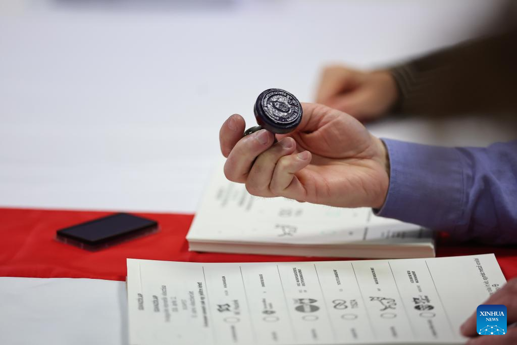 A staff member stamps a ballot at a polling station in Budapest, Hungary, April 12, 2026. Hungary's parliamentary elections kicked off at 6:00 a.m. local time (0400 GMT) on Sunday, with about 8.1 million eligible voters, according to the National Election Office. (Photo by David Balogh/Xinhua)
