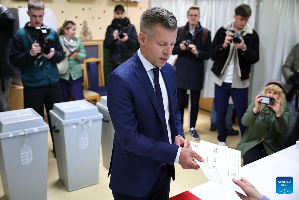 Peter Magyar, leader of Hungary's opposition party Tisza, casts his ballot at a polling station in Budapest, Hungary, April 12, 2026. Hungary's parliamentary elections kicked off at 6:00 a.m. local time (0400 GMT) on Sunday, with about 8.1 million eligible voters, according to the National Election Office. (Photo by David Balogh/Xinhua)