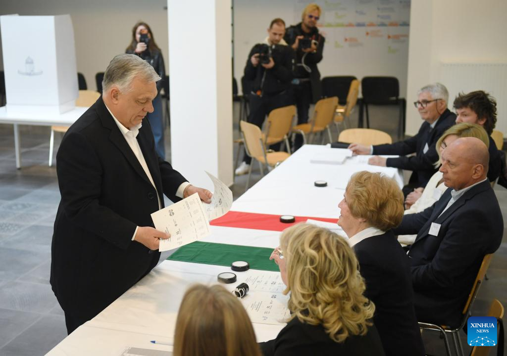 Hungarian Prime Minister Viktor Orban casts his ballot at a polling station in Budapest, Hungary, April 12, 2026. Hungary's parliamentary elections kicked off at 6:00 a.m. local time (0400 GMT) on Sunday, with about 8.1 million eligible voters, according to the National Election Office. (Xinhua/He Canling)