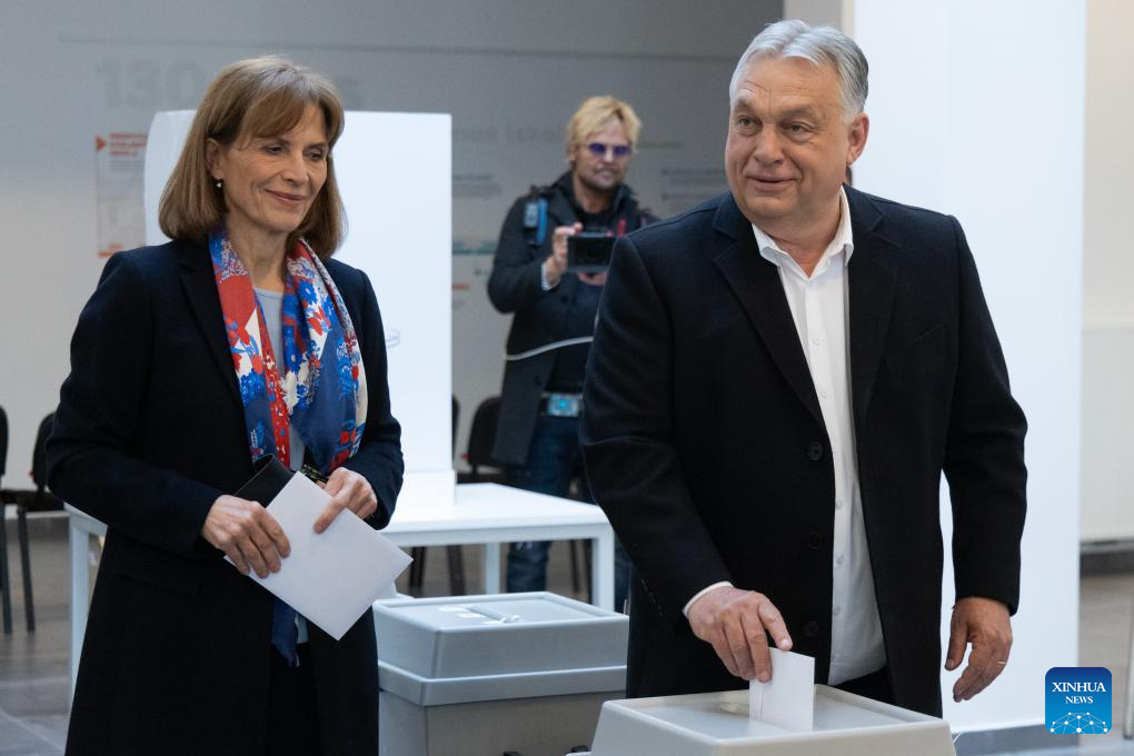 Hungarian Prime Minister Viktor Orban (R) and his wife Aniko Levai cast their ballots at a polling station in Budapest, Hungary, April 12, 2026. Hungary's parliamentary elections kicked off at 6:00 a.m. local time (0400 GMT) on Sunday, with about 8.1 million eligible voters, according to the National Election Office. (Photo by Attila Volgyi/Xinhua)