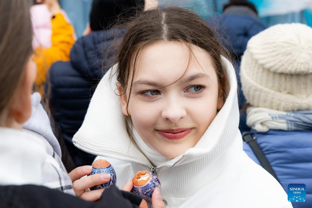 A woman holds Easter eggs while participating in Easter celebrations in Vladivostok, Russia, April 12, 2026. Various recreational activities were hosted on Sunday to mark the Orthodox Easter holiday. (Photo by Andrey Matveenko/Xinhua)