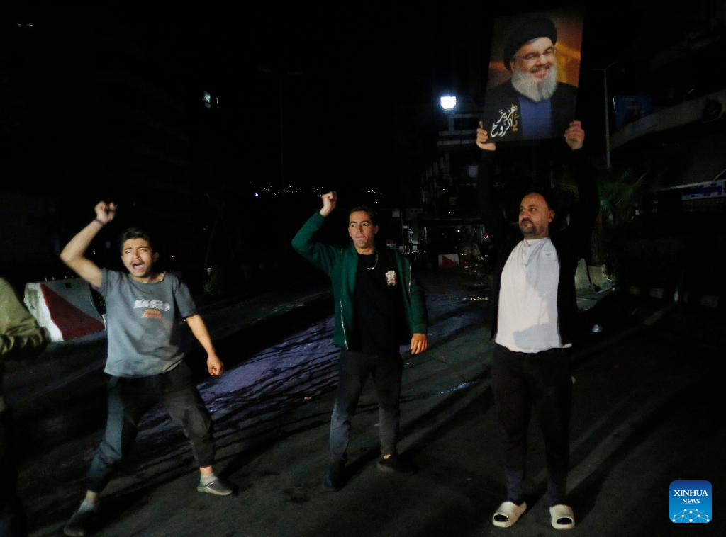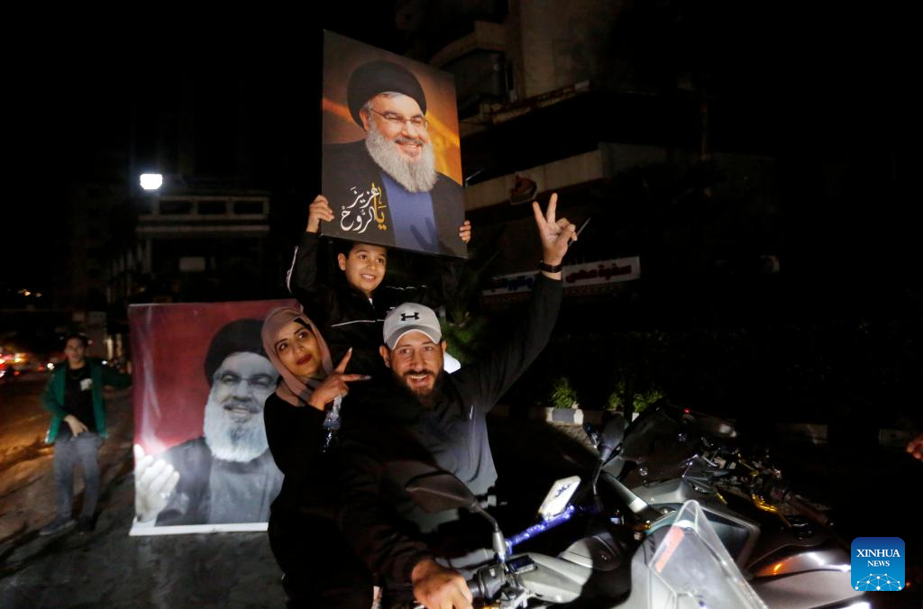 Displaced people bearing images of the late Hezbollah leader Sayyed Hassan Nasrallah return to the southern suburb of Beirut, Lebanon on April 16, 2025. A 10-day ceasefire between Israel and Lebanon took effect at midnight between Thursday and Friday local time (2100 GMT), following an earlier announcement by U.S. President Donald Trump. (Photo by Bilal Jawich/Xinhua)