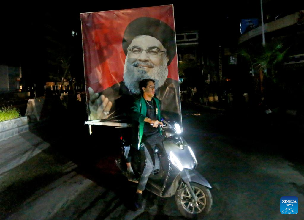 A displaced man bearing an image of the late Hezbollah leader Sayyed Hassan Nasrallah returns to the southern suburb of Beirut, Lebanon on April 16, 2025. A 10-day ceasefire between Israel and Lebanon took effect at midnight between Thursday and Friday local time (2100 GMT), following an earlier announcement by U.S. President Donald Trump. (Photo by Bilal Jawich/Xinhua)