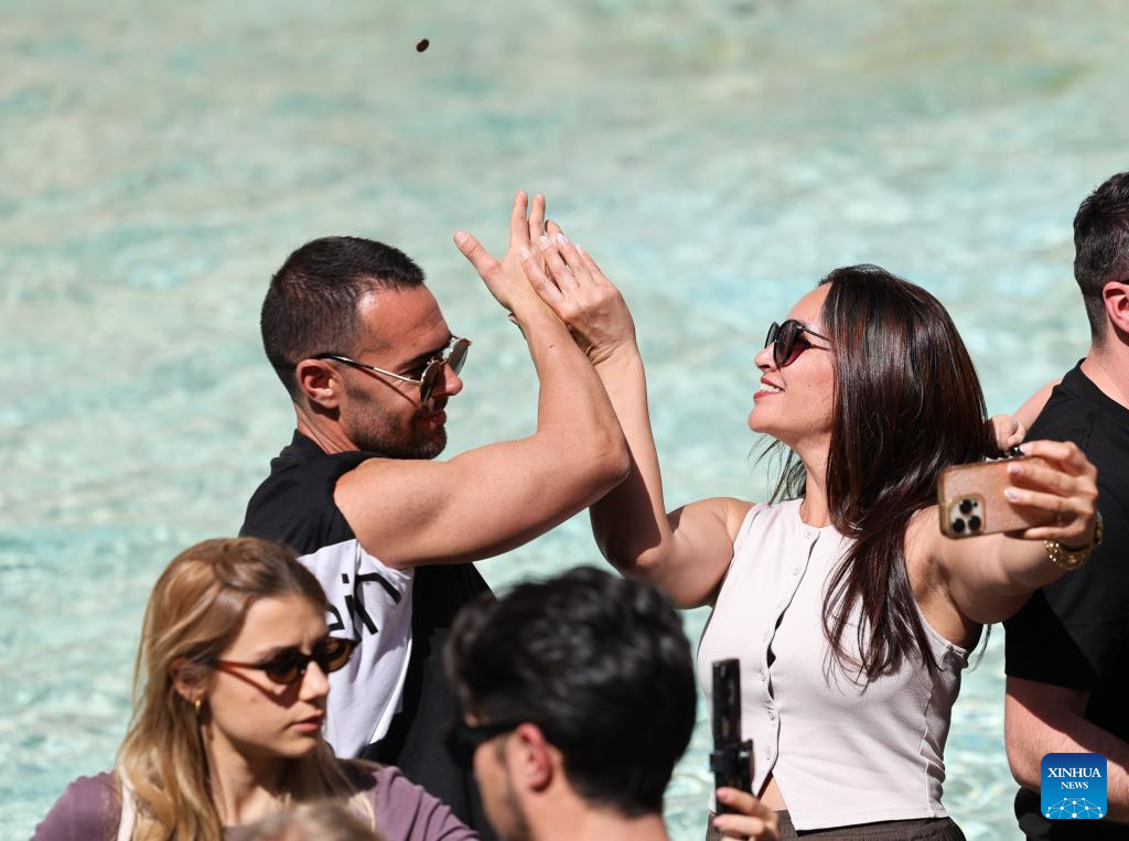 Tourists toss a coin to make a wish at the Trevi Fountain in Rome, Italy, April 17, 2026. (Xinhua/Li Jing)