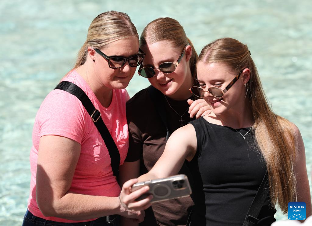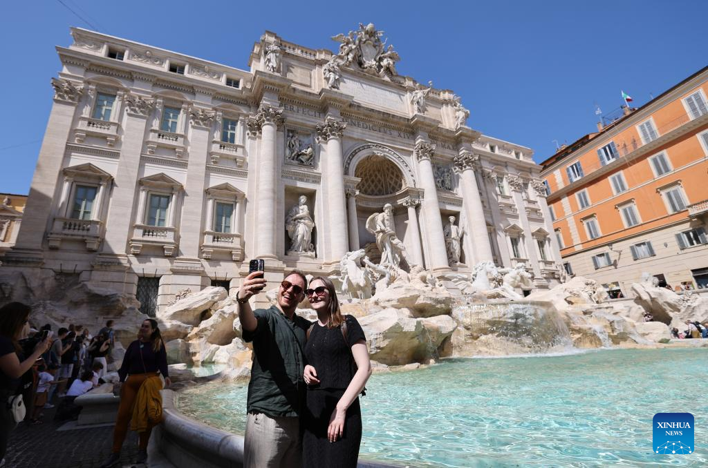 Tourists take selfies at the Trevi Fountain in Rome, Italy, April 17, 2026. (Xinhua/Li Jing)